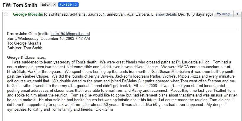 ![]() Francis McNIGHT Leiding | The summer before we began our junior year, Mr. and Mrs. Henry gave me a call. They had a favor to ask. It seems that an old family friend had recently moved to Fort Lauderdale with his two daughters and Mrs. Henry was hopeful that I would introduce the older girl to our friends. These sisters lost their own mother many years before and then there had been a more recent divorce from a step mom. Francie became a dear friend of mine and her sister Mary became a life long friend to my sister Pamela and her group of friends. This was a tough situation for a Dad and the two girls, and housekeepers were hired to fill in the gaps. Francie was a very sensitive, generous and highly intelligent person. The girls in our group all enjoyed her company. We always stayed in touch beyond high school. Fran experienced a lot of sadness in her life and never really enjoyed good health. She loved my MOM and my family. Shortly after we began working on this reunion I called her at her home in Kansas City. I told her she just had to plan to make the trip to Lauderdale. She said ,'Barb, I don't think I can make the plane trip' . She had been fighting cancer for the second time. We talked on the phone again one more time before she slipped away. Fran always enjoyed Squire and he could make her laugh. She hated to hear that he was gone. Barb Greene Jackson barbjoe63@yahoo.com |