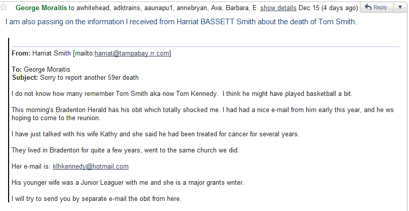 ![]() Carol ZIMMER Bellamy | Carol Zimmer Most of us remember Carol for her beauty, her athleticism as a cheerleader, as a fun girl, and a smart student. She was also highly analytical in her thinking. In her studies of her Christian Scientist faith in high school, she would read paragraphs of CS literature and try to explain it to me. When I spent the night on Saturdays, I always went to her church with her family. Carol went to Principia, a Christian Science college in St. Louis, for her freshman year. She found it limiting in scope and longed for the big, more exciting experience at Univ. of Florida. As a cheerleader there, her future husband Ray Bellamy, a medical student, spotted her in the stadium and vowed to woo her. I was the only attendant in their wedding in Ft. Lauderdale. Shortly after that, they moved to various cities as Dr. Ray went through his trainings. First city might have been San Francisco which they loved, but felt hard pressed financially to partake of the pleasures offered. My memory is that they used to play cards with Lyn Chaffee and Dick Roberts who were there also. Carol went to work, an endeavor that Ray always encouraged. It was not until Carol's cancer appeared many years later that I learned that she had undergone surgery for ovarian cancer as a very young woman in San Francisco. Ray called Carol's mom, a Christian Science reader, and explained that Carol needed surgery immediately and that was how it was going to be. Later when she and Ray lived in Louisville, they adopted a boy and then a girl. (This son eventually went into Orthopedic Surgery like his dad.) When they had a chance to 'settle down' Ray chose to start his practice in Tallahassee. There was a building at FSU named Bellamy Hall for one of Ray's ancestors. During this time, Carol took her intellectualism, analytical ability, and passion for causes to law school at FSU. As she told it, one of the impediments of going to law school was her concern of how she could get up to go to class and still cook breakfast for the family. (Carol's parents were makers of large breakfasts.) Ray stepped up and volunteered to do it himself. When Carol was in law school, she was fascinated in studying the law and how it applied to 'how we came to be where we are today.' Not having time to send out Christmas cards in December one year, she was the first one I knew to mail New Year's cards of the same variety. (I've since adopted this practice as needed.) A few of the cards showed photos of ski trips and also a vacation beach home that they owned elsewhere in FL. She was passionate about certain causes including civil rights and the environment. Once I visited her home in Tallahassee and noticed that she did not seem to use the air conditioning. It was hot! She explained that they only ran it when they were out of town to prevent mold. Carol entered politics at the local level and eventually was elected Mayor of Tallahassee. Certain classmates have remarked seeing her big photo and 'Welcome to Tallahassee' sign in the airport there. Once Carol and her children came to visit me in Cincinnati for the day as she was in nearby Indianapolis attending a national level meeting for mayors. She and my sons and I had a lot of fun at the Cincinnati Zoo for the day. Ray Bellamy was a varsity tennis player at Florida and played in tournaments all around as an adult. Not at all intimidated, Carol took up tennis. In fact, at our 1989 reunion at the Lago Mar, she declined to go deep sea fishing with Ray and their son and my sons and me, choosing to stay back to be able to play tennis with classmates. By this time, her cancer had returned. I last saw Carol some months before she died when she was at home undergoing treatments. She was extremely thin, but was up and around and dressed, all covered up in knee socks and long sleeves.. She had declined to go out to lunch, not knowing what she would be able to eat, but asked that I bring a sandwich with me so that we could have a 'picnic.' She said that the hardest part of her illness was in relationship to her children. She wrote each of them letters to be read after her death. I still admire her and miss her. Bonnie Linane Stowell |