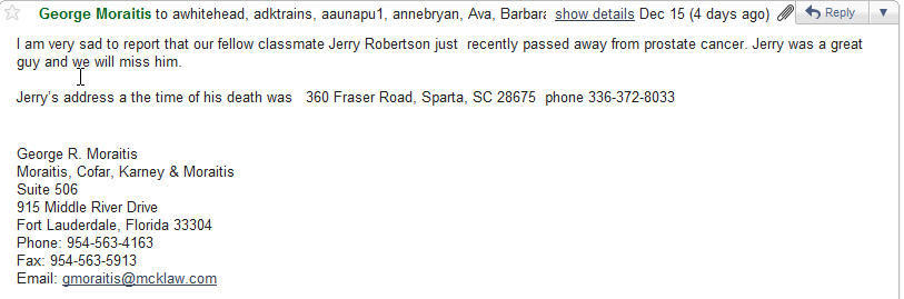 ![]() Ralph McMillian | I remember Ralph for the smile in his eyes and his overall sweet disposition. Ralph was on my list to track down for our reunion. I left several messages at his home and then one day his wife returned my call. We talked several times and I just wanted you all to know some things about Ralph that his wife said I could share. She was his second wife and they were together a long time and were very happy. They lived on the west coast of Florida in recent years. Ralph served in the US Army on the ground in Vietnam. He was there for two tours of duty. After Vietnam he came back to his first wife and finished his education out west. Ralph was a practicing psychologist in a local Mental Health Clinic. I kept very good notes about all this but several months ago I lost my hard drive so forgive me for not being more specific about his children but he had several. Five years ago Ralph began to be very sick. They are sure that it was a result of Exposure to Agent Orange . His illness did not last long. Barb Greene Jackson barbjoe63@yahoo.com |